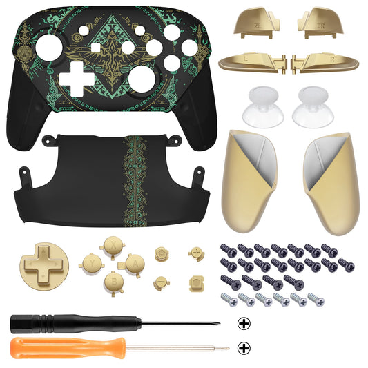 eXtremeRate Nintendo Switch Pro用交換フルセットシェル、フェイスプレート、バックプレート、ハンドル&ボタンキット-トーテム オブ キングダム【ブラック】暗闇で光る