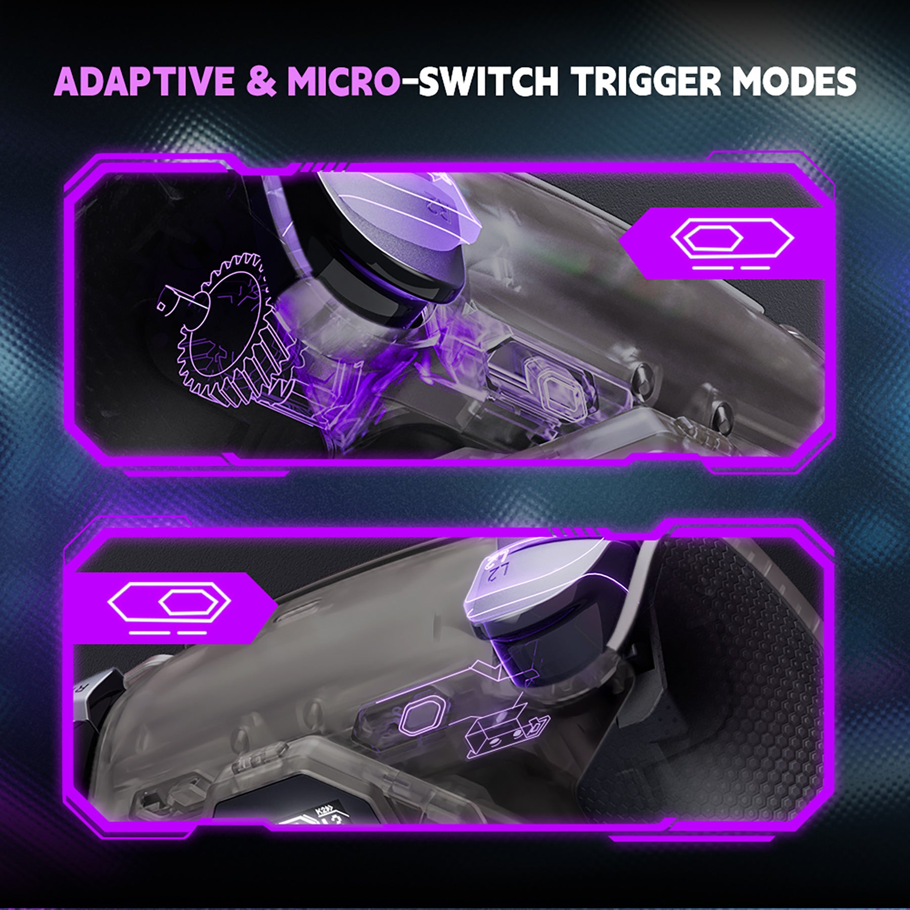 6. L2・R2はデジタル式「クリックトリガー」とアダプティブトリガーを切替可能。シューティングでは短いストローク、レースでは繊細な操作が可能。